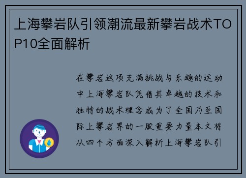 上海攀岩队引领潮流最新攀岩战术TOP10全面解析